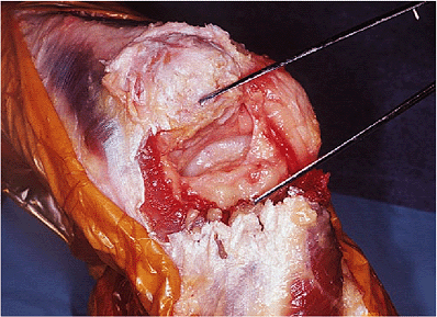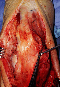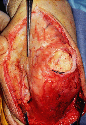 Figure 11-6. Large defect at the central attachment of the triceps in patient with total elbow arthroplasty.