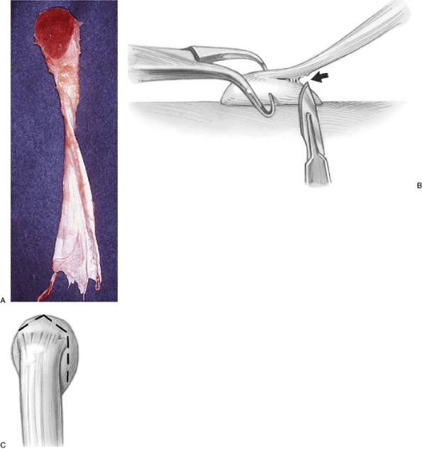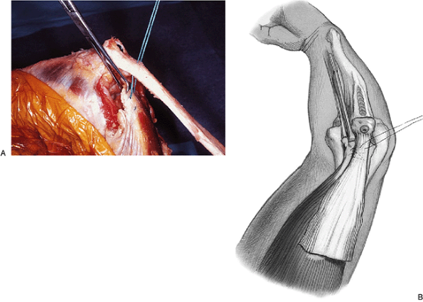 residual tendon is contracted and cannot be advanced to bone (Fig. 11-6) but the anconeus is present, Kocher’s interval is entered and the anconeus is mobilized (Fig. 11-7).