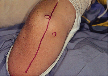 Figure 11-2. Midline incision showing tip of olecranon and medial epicondyle.
