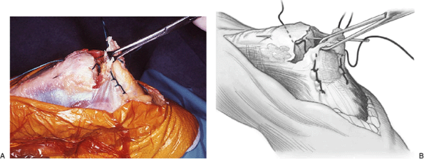 Figure 11-9. A,B: The anconeus is sutured with a crisscross stitch into bone. The defect is sewn to itself.