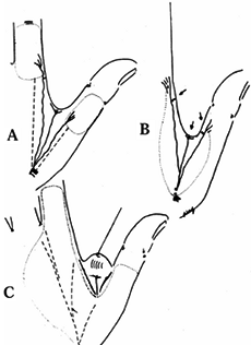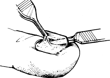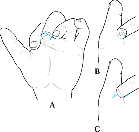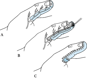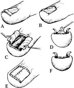 Figure 38.25. A: A hook-nail deformity and normal contour of fingertip (dotted line) are shown. B: This is the procedure for removal of nail plate and skin marking. C: