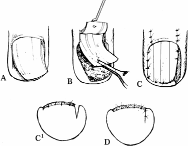 Figure 38.24. A: Longitudinal curvature of nail is shown. B: A full thickness flap of matrix is illustrated. C: The epidermis is excised, and the flap is rotated. D: The wedge is sutured.