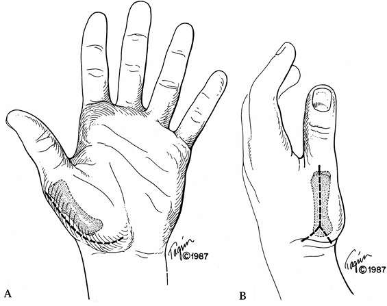 Figure 40.3. Surgical approaches to the thumb metacarpal: palmar (A) and dorsal (B). -