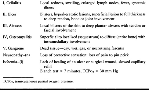 the extent of infection—cellulitis, ulcer, abscess, osteomyelitis, and