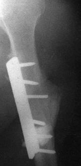A sinogram tract down to metal and bone. The patient had persistent drainage for 7 months following open plating of the humerus. Notice that the fracture is healed. |