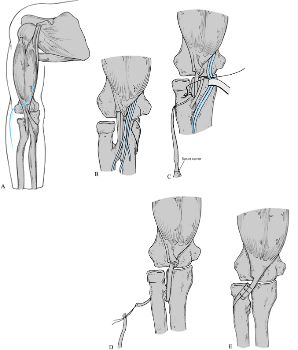 posterior elbow, find the ulnar nerve. Open the cubital tunnel and