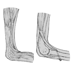the V proximal. Expose the humeroulnar joint, leaving the triangular