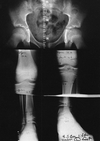 The distal femoral and proximal tibial physes contribute constant proportions to the growth of the leg. (From Moseley CF. Leg-Length Discrepancy. In: Morrissy RT, Weinstein SL, eds. Lovell & Winter’s Pediatric Orthopaedics. Philadelphia: J.B. Lippincott, 1996:855, with permission.) |