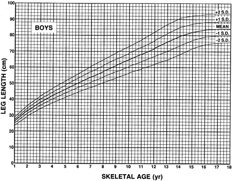Graph of total limb length (femur plus tibia only) for boys. An individual boy may be plotted instantaneously and projected into the future based on his current situation. (From Anderson M, Messner MB, Green WT. Distribution of Lengths of the Normal Femur and Tibia in Children from One to Eighteen Years of Age. J Bone Joint Surg 1964;46A:1197, with permission.) |