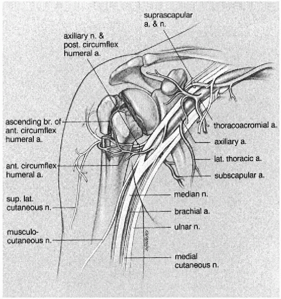 FIGURE 5-2. Right proximal humerus, arteries, nerves, and brachial plexus.