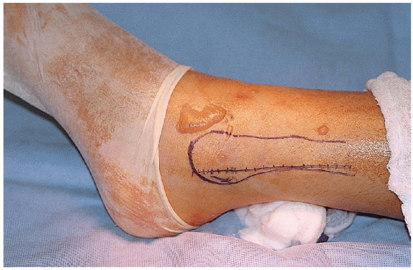 FIGURE 33-16. The medial incision is slightly curved and centered over the medial malleolus.