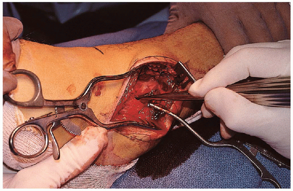 FIGURE 33-18. Visualization of the anteromedial corner of the ankle joint.