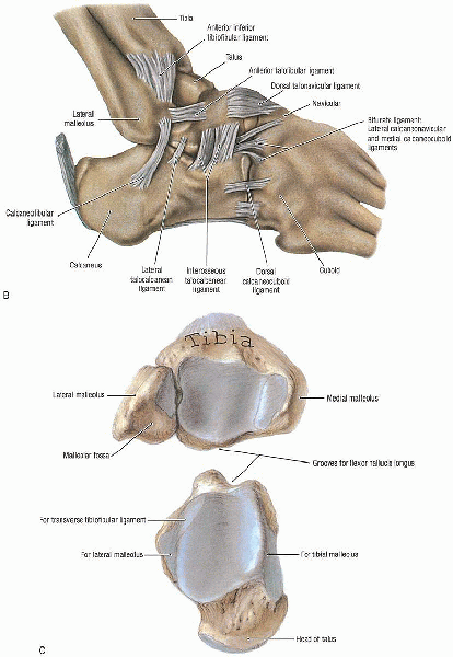 FIGURE 33-1. A: Medial view of the ligaments of the ankle. B: Lateral view of the ligaments of the ankle. C: Disarticulated talus. (From Agur AMR, Lee MJ. Grant’s atlas of anatomy, 10th ed. Philadelphia: Lippincott Williams & Wilkins, 1999, with permission.)