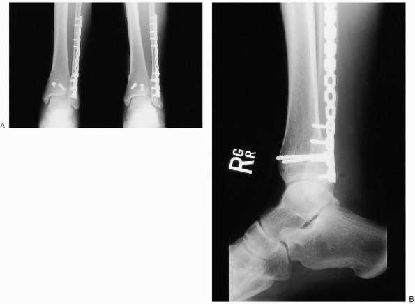 FIGURE 33-2. A: The anteroposterior radiograph demonstrates an isolated fibula fracture. B: