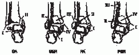 The Lauge-Hansen classification for ankle fractures is based on the position of the foot at the time of injury and the force direction. SA, supination-adduction; SER, supination-external rotation; PA, pronation-abduction; PER, pronation-external rotation. (From Carr JP, Trafton PG: Malleolar fractures and soft tissue injuries of the ankle. In: Browner BD, Jupiter JB, Levine AM, eds. Skeletal trauma, 2nd ed. Philadelphia: WB Saunders, 1998, with permission.)  |