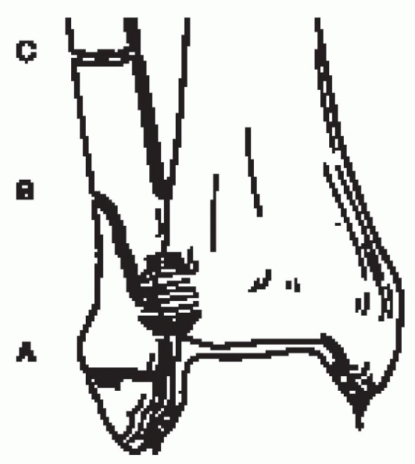 The Danis-Weber classification is based on the level of the fibular fracture. (From Carr JP, Trafton PG. Malleolar fractures and soft tissue injuries of the ankle. In: Browner BD, Jupiter JB, Levine AM, eds. Skeletal trauma, 2nd ed. Philadelphia: WB Saunders, 1998, with permission.)  |