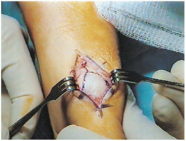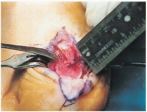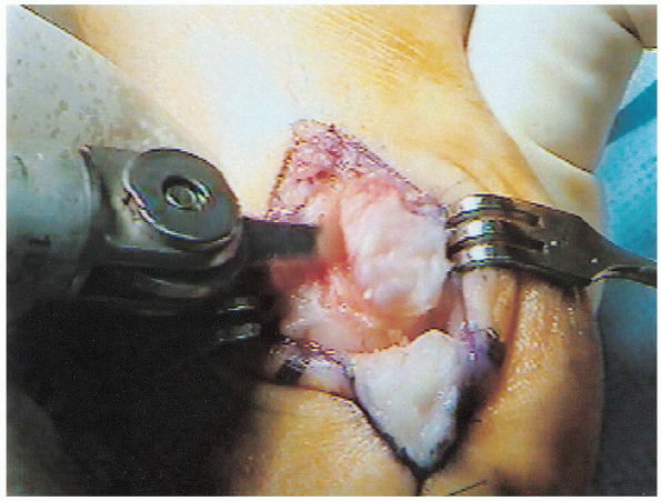 An exostectomy is performed with a sharp osteotome or a sagittal saw at the level of the sulcus (Fig. 34-6). The cut should be made parallel to the medial margin of the foot and perpendicular to the dorsum of the foot.