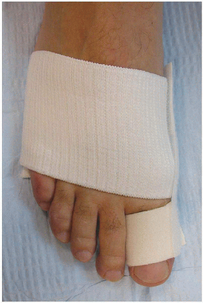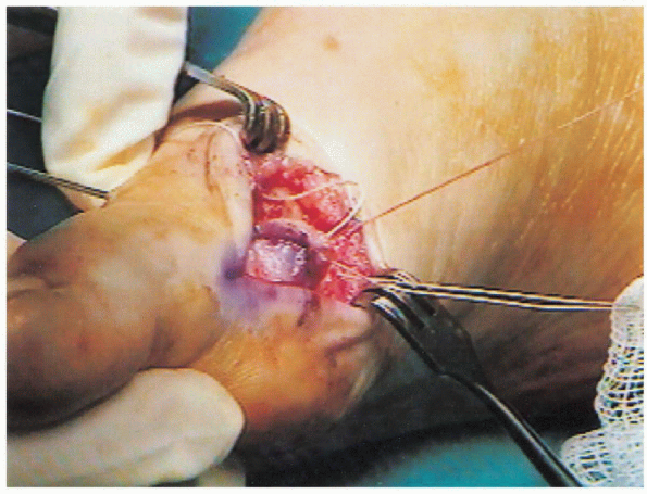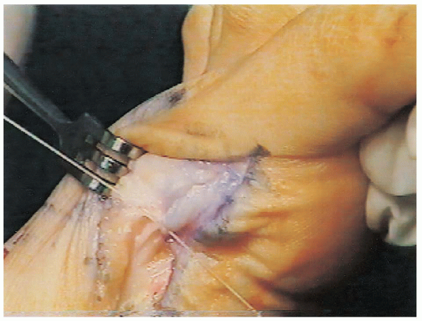 FIGURE 34-25. Suture in the dorsolateral capsule of the first metatarsal head.