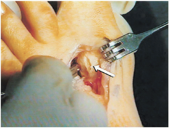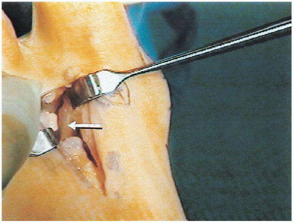FIGURE 34-33. The osteotomy is marked (arrow) with an osteotome.