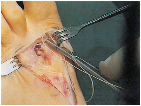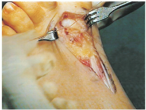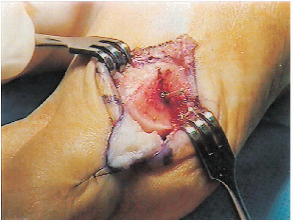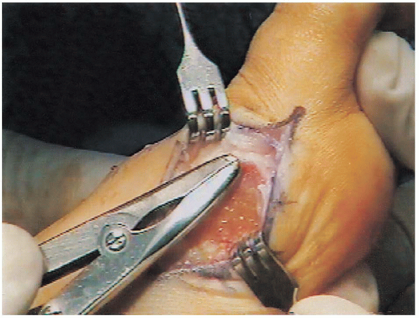 Two 25-gauge needles are placed in the joint to determine the plane of the metatarsal cuneiform joint. A baby Hohmann retractor is placed subperiosteally on the lateral side to protect the perforating branch of the dorsalis pedis artery and the deep peroneal nerve. |