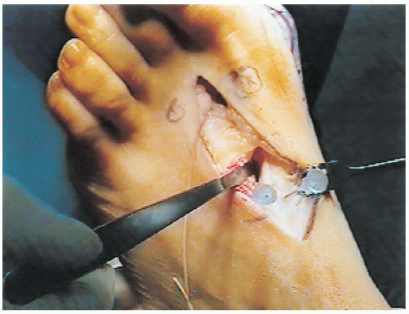 The conjoint tendon is transferred to the dorsal lateral capsule of the first metatarsal head with 0-Vicryl to act as a dynamic adductor of the first ray and plantar flexor. |