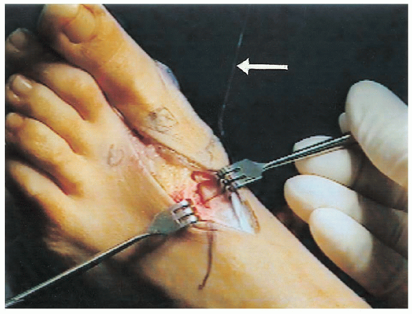 FIGURE 34-26. Suture in the dorsomedial capsule of the second metatarsal head.