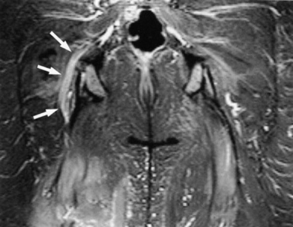 FIGURE 6.10 ● Sciatic neuropathy associated with rhabdomyolysis. Increased signal in the sciatic nerve (arrows) is shown on this coronal fluid-sensitive fat-suppressed image. Note the increased signal in multiple muscles.