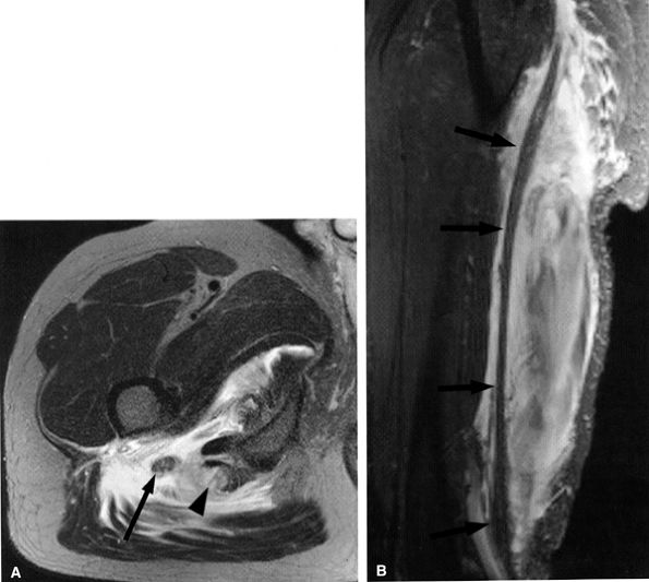 FIGURE 6.11 ● Hamstring tendon tear with secondary edema around the sciatic nerve. Axial T2-weighted (SA) and sagittal T2-weighted fat-suppressed (B) images show partial avulsion of the conjoined tendon of the biceps and semitendinosus muscles (arrowhead) with extensive edema around the sciatic nerve (arrows).