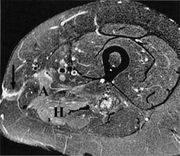 FIGURE 6.12 ● Denervation edema after resection of a sciatic nerve tumor. This axial T2-weighted image demonstrates denervation edema in the hamstring muscles (H) and adductor magnus muscle (A).