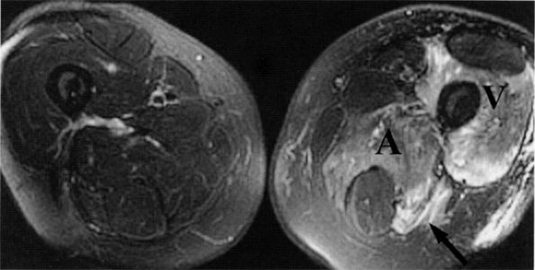 FIGURE 6.13 ● Lumbosacral plexopathy with denervation edema in the femoral, obturator, and sciatic nerve distribution. Increased signal in the vasti muscles (V) and adductor magnus (A) and hamstring muscles (arrow) is shown on this axial T2-weighted fat-suppressed image.