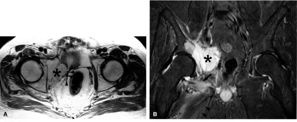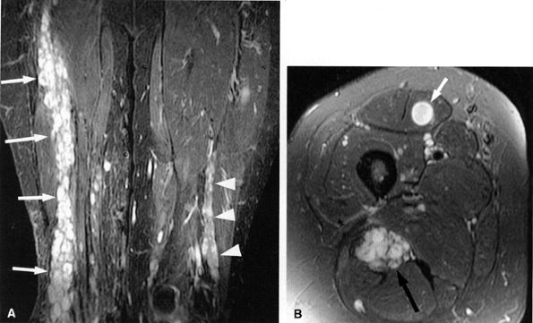 FIGURE 6.14 ● Plexiform neurofibromatosis. (A) Coronal T2-weighted fat-suppressed image depicting fusiform enlargement and increased signal of the right (arrows) and left (arrowheads) sciatic nerves. (B) Axial T2-weighted fat-suppressed image demonstrating the “bag of worms” appearance of the right sciatic nerve (black arrow). Note an intramuscular neurofibroma in the rectus femoris muscle (white arrow).