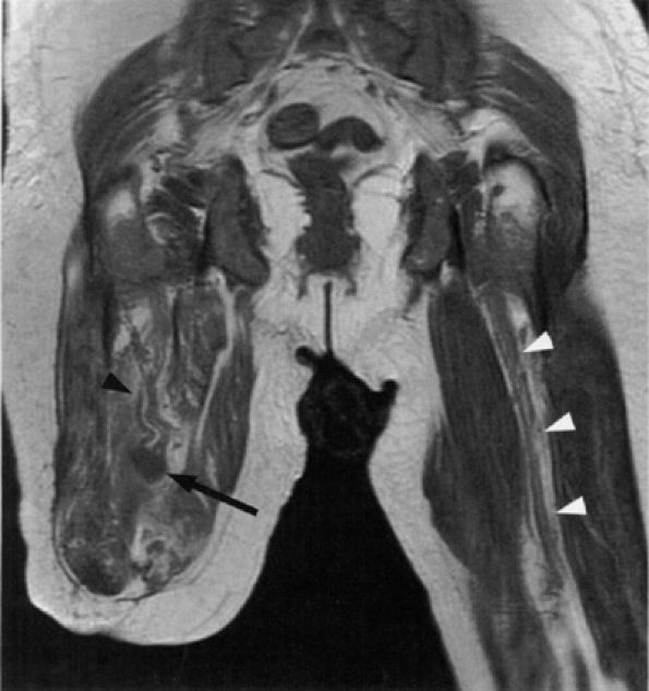 FIGURE 6.15 ● Amputation neuroma. Coronal T1-weighted image demonstrating an amputation neuroma in the right sciatic nerve (arrow). Compare the thickened fascicular pattern of the nerve proximal to the neuroma (black arrowhead) with the normal left sciatic nerve (white arrowheads). (Courtesy of Laercio Rosenberg, MD, Sao Paulo, Brazil)