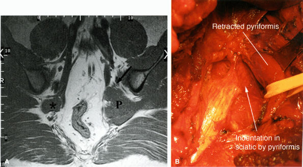 FIGURE 6.16 ● Surgically proven left piriformis muscle syndrome. (A) Axial T1-weighted image demonstrates a markedly enlarged left piriformis muscle (P) displacing the sciatic nerve (arrow). The normal right piriformis (asterisk) is much smaller. (B) A posterior view during surgery demonstrates indentation on the left sciatic nerve from the piriformis muscle. (Courtesy of Stephen Russel, MD, NY)