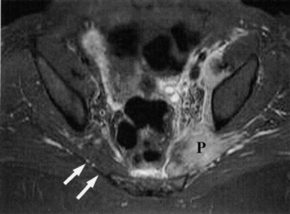 FIGURE 6.17 ● Piriformis muscle syndrome in a patient kicked by a horse in the left buttock. This axial T2-weighted fat-suppressed image shows engorgement and increased signal in the left piriformis muscle (P), with edema in the region of the sciatic nerve. Compare with a normal right piriformis muscle (white arrows). (Courtesy of Frank Crnkovich, MD, Colorado)