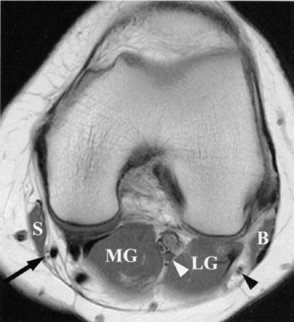FIGURE 6.21 ● Normal saphenous, tibial, and common peroneal nerves in the knee. An axial PD-weighted image depicts the branches of the saphenous nerve (arrow) lateral to the sartorius muscle (S); the tibial nerve (white arrowhead) between the lateral (LG) and medial (MG) heads of the gastrocnemius muscle; and the common peroneal nerve (black arrowhead) between the gastrocnemius muscle and biceps femoris muscle (B). Note that the common peroneal nerve is already split into its deep and superficial branches.