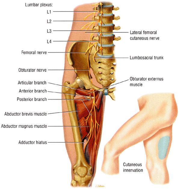 FIGURE 6.1 ● The origins of the three major nerves supplying the lower extremity: the sciatic nerve, the femoral nerve, and the obturator nerve.