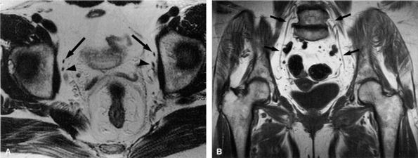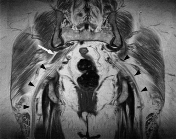 FIGURE 6.7 ● Coronal T1-weighted image of the sciatic nerve demonstrating the normal fascicular pattern of both sciatic nerves (arrowheads). A slip of the right piriformis muscle is noted (arrow).