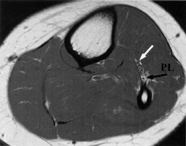 On axial MR images, it is not uncommon to detect major divisions of the larger nerves before they actually branch away from each other. The peroneal and tibial divisions of the sciatic nerve can be visualized as they descend together in the thigh. Similarly, in the distal knee, the common peroneal nerve is subdivided into its two major branches, the superficial and deep peroneal nerves, long before the two divisions physically separate from one another.