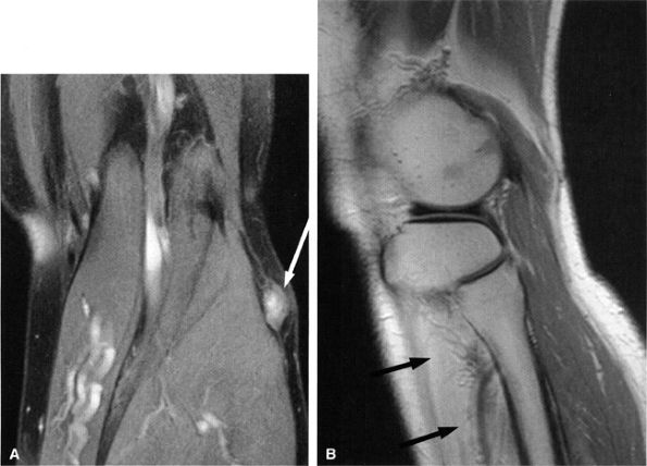 and its etiology is not always known.19 On MR images it is depicted as signal alterations in only a select group of muscles along a single nerve distribution. For example, it is not unusual for only the plantaris and popliteal muscles to depict muscle denervation changes in tibial nerve entrapment. Similarly, denervation signal isolated to the anterior tibial muscle with relative sparing of the extensor digitorum longus muscle is often depicted in common peroneal neuropathy. Neurography may illustrate greater involvement of isolated nerve fascicles.