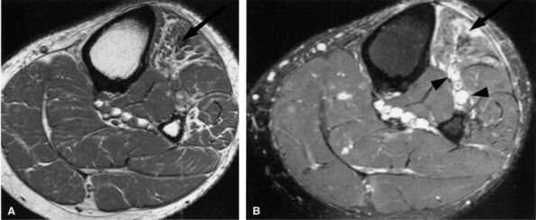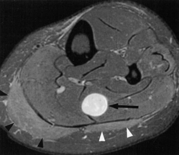 FIGURE 6.38 ● Proximal tibial neuropathy and muscle denervation in the leg secondary to a nerve sheath tumor. Axial T2-weighted fat-suppressed image demonstrates a hyperintense nerve sheath tumor (arrow) in the soleus muscle, in the region of a tibial nerve ramus, with secondary denervation edema in the medial (black arrowheads) and lateral (white arrowheads) heads of the gastrocnemius muscle.