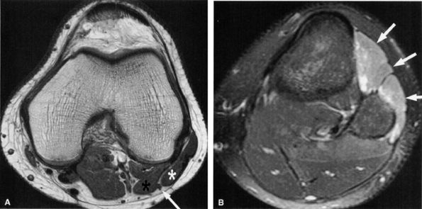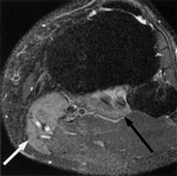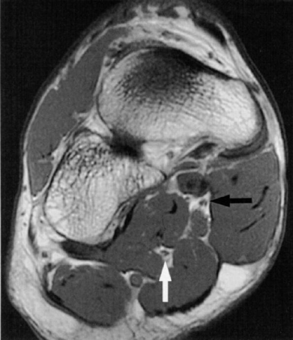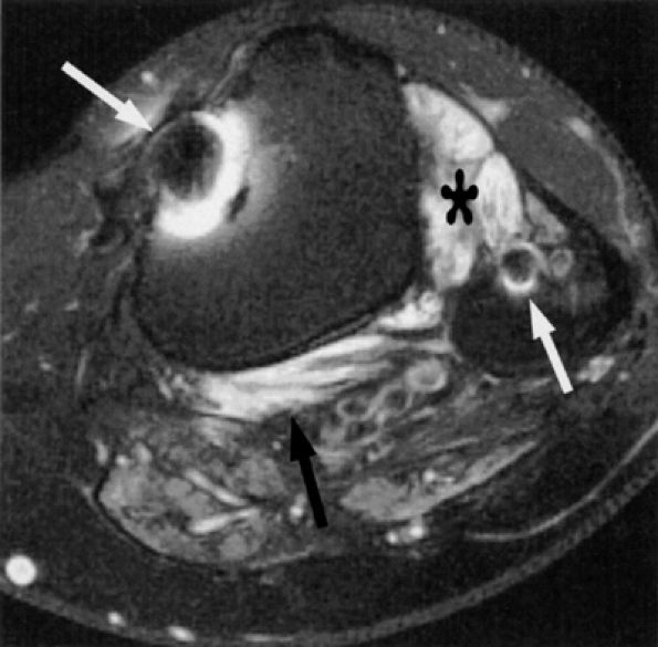 FIGURE 6.39 ● Proximal tibial neuropathy with denervation edema. Axial T2-weighted fat-suppressed image demonstrates denervation edema of the popliteus (black arrow) and medial head of the gastrocnemius muscles (white arrow).