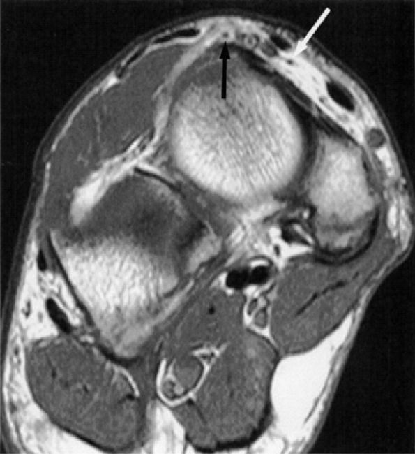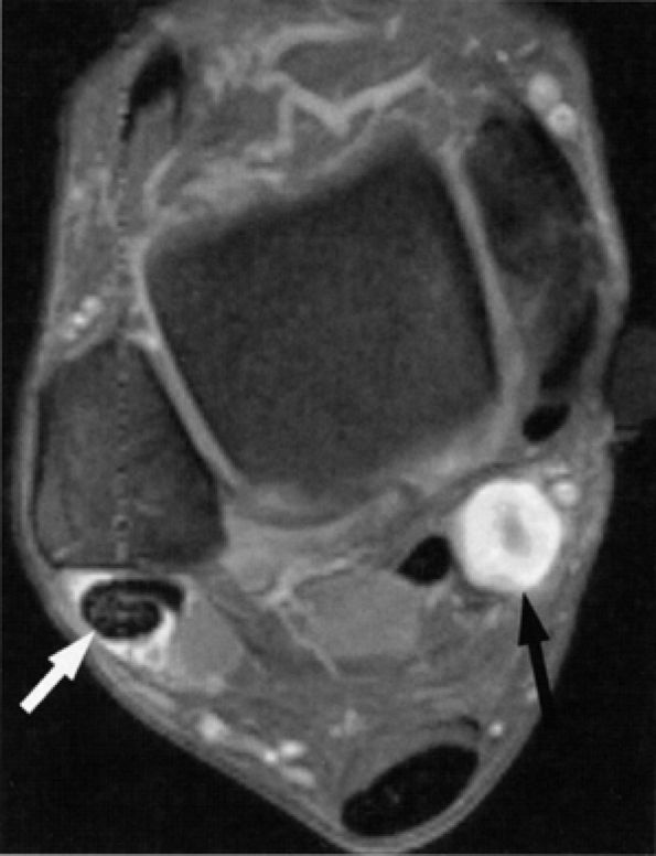 FIGURE 6.48 ● Tarsal tunnel nerve sheath tumor. Axial T1-weighted fat-suppressed post-gadolinium image demonstrating a hyperintense nodule (black arrow) with a hypo-intense center (“target sign”) in the tarsal tunnel. Note incidental finding of peroneal tendon tenosynovitis (white arrow).