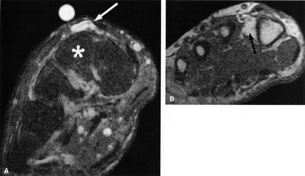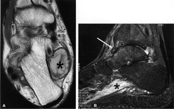 FIGURE 6.49 ● Tarsal tunnel syndrome and medial plantar nerve denervation edema due to proliferative synovitis. (A) Axial T2-weighted image demonstrates a synovial mass (asterisk) in the tarsal tunnel. (B) Sagittal T2-weighted fat-suppressed image illustrates denervation edema in the flexor digitorum brevis muscle (asterisk). Note associated osteoarthritic changes in the anterior tibiotalar joint (arrow).