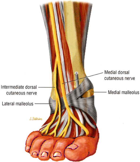 of the lower leg and dorsum of the foot with sparing of the first web space (innervated by the deep peroneal nerve). The pain is worsened with activity. Focal swelling, point tenderness, and exacerbation of symptoms with pressure occur approximately 10 to 12 cm above the ankle joint, where the nerve exits the deep fascia. When muscle herniation is the causative agent, a focal mass accentuated by resisted dorsiflexion may be seen.24 Prior trauma, particularly chronic ankle sprain, has been noted in approximately 25% of patients with superficial peroneal neuropathy. The neuropathy is most likely related to traction and stretching of the nerve.2 Impingement on the nerve following prior anterior compartment fasciotomy has also been described.