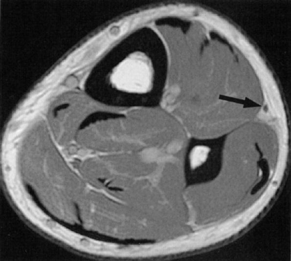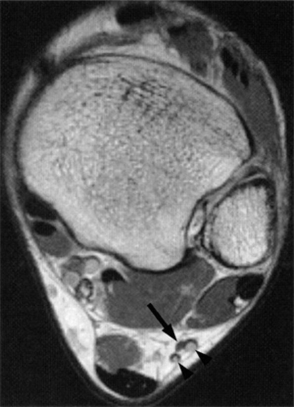 FIGURE 6.61 ● The normal sural nerve. Axial T1-weighted image demonstrates the sural nerve (arrow) deep to subcutaneous vessels (arrowheads).