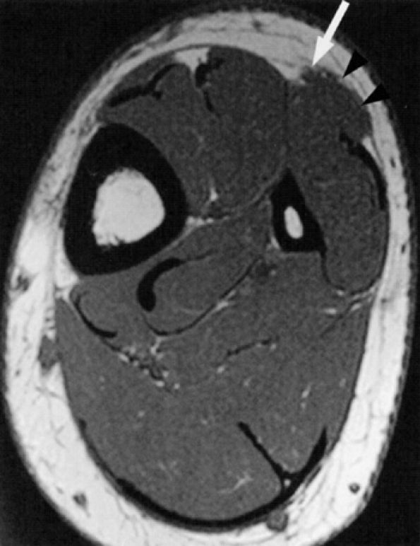 FIGURE 6.37 ● Superficial peroneal neuropathy secondary to muscle herniation. Axial T1-weighted image shows fascial herniation of the peroneus longus muscle (arrowheads) abutting on the superficial peroneal nerve (arrow).
