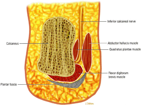 branches, one to the periosteum of the medial calcaneal tuberosity, one to the abductor digiti minimi, and one to the flexor digitorum brevis muscle. The long plantar ligament and the quadratus plantae may also be innervated by the inferior calcaneal nerve.11