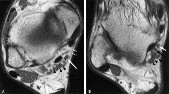 FIGURE 6.44 ● The normal tarsal tunnel. (A) Axial T1-weighted image of the upper tunnel demonstrates the tibial nerve (arrow) deep to the flexor retinaculum (small arrows) and anteromedial to the tibial vessels (arrowheads). (B) Axial T1-weighted image in the lower tunnel demonstrates the medial (white arrow) and lateral (black arrow) plantar nerves deep to the tibial vessels (arrowheads).