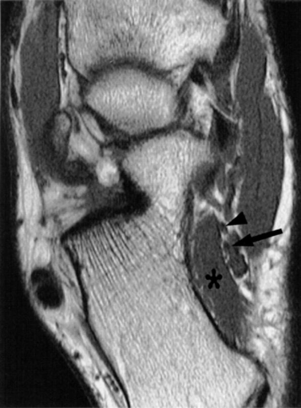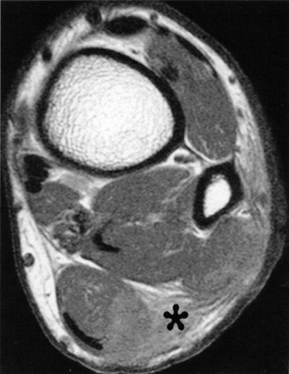 FIGURE 6.62 ● Sural nerve laceration in a 20-year-old male patient. Axial T1-weighted image demonstrates edema and obliteration of fat planes in the region of the sural nerve (asterisk). Note concomitant lacerations of the soleus and peroneal muscles.