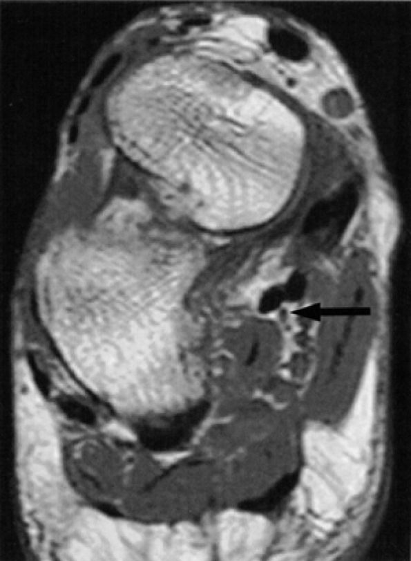 FIGURE 6.3 ● Proximal tibial entrapment in a 49-year-old patient with neuropathic foot pain. Symptoms resolved following an intra-articular steroid injection of the knee. This axial T2-weighted fat-suppressed image depicts a loose body in the popliteal muscle bursa (arrow), abutting on the neurovascular structures (arrowheads).There are many variations in muscle innervation and many communicating nerve loops in the lower extremity, particularly in the foot region.43 For example, the deep peroneal nerve may, in rare instances, supply muscles such as the adductor hallucis and flexor hallucis brevis, muscles typically innervated by the lateral and medial plantar nerves. This variability can affect the distribution of signal alterations within denervated muscles and may produce puzzling MR patterns. Familiarity with variations in innervation aids in interpreting unexpected muscle denervation signal alterations. -
